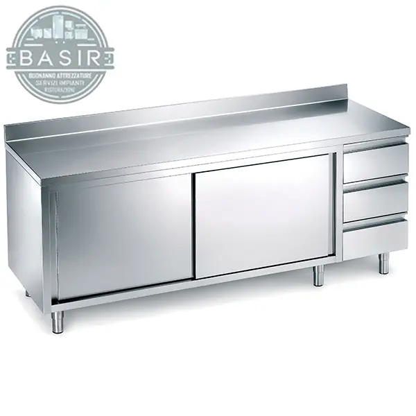 Grazie alla disponibilità di ordinare su misura, il tavolo in acciaio può essere adattato alle specifiche esigenze di ogni cucina, ottimizzando gli spazi e migliorando l’efficienza operativa. Gli armadi integrati offrono spazio aggiuntivo per riporre utensili, attrezzature e ingredienti, mantenendo tutto a portata di mano e contribuendo a un ambiente di lavoro ordinato. Questa caratteristica è particolarmente utile nelle cucine ristorative, dove ogni centimetro conta e la gestione dello spazio è essenziale per un flusso di lavoro fluido.